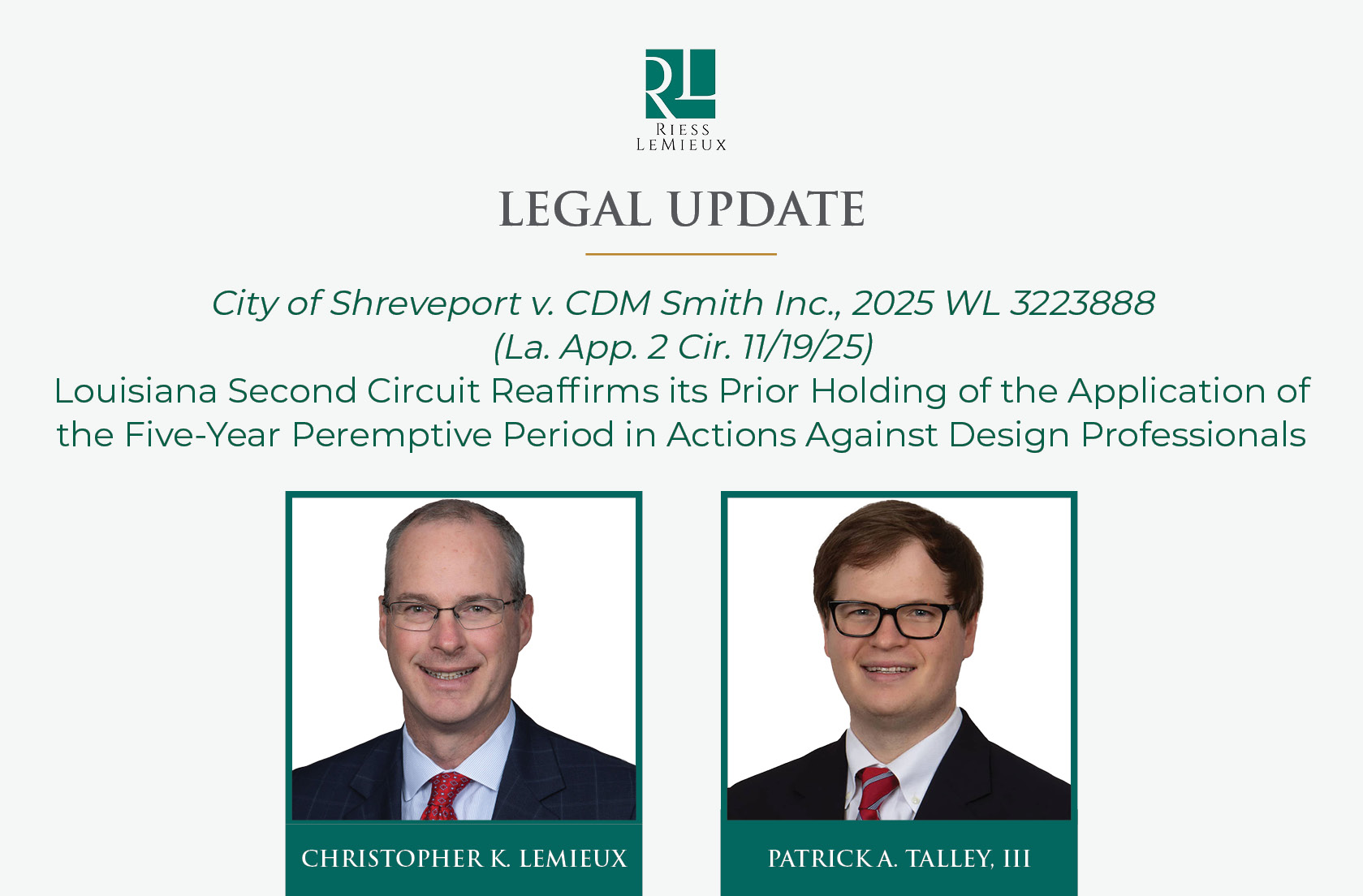 Legal Update: Louisiana Second Circuit Reaffirms its Prior Holding of the Application of the Five-Year Peremptive Period in Actions Against Design Professionals Authors: Christopher K. [...]