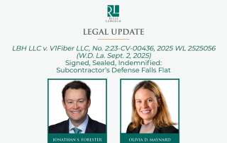 Legal Update: Signed, Sealed, Indemnified: Subcontractor’s Defense Falls Flat Authors: Jonathan S. Forester and Olivia D. Maynard LBH LLC v. V1Fiber LLC, No. 2:23-CV-00436, 2025 WL 2525056 (W.D. La. Sept. 2, 2025). In LBH LLC v. V1Fiber LLC, the Western District Court of Louisiana was faced with whether the defense and indemnity provisions of a contract were null and void [...]