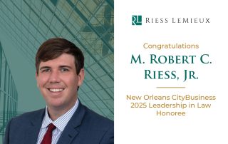 We are excited to announce that M. Robert C. Riess, Jr., a partner at Riess LeMieux, has been recognized by New Orleans CityBusiness and named to their 2025 Leadership in Law Class. This special publication recognizes area professionals in the field of law for their career and community accomplishments. Leadership in Law honors legal professionals in the New Orleans area [...]