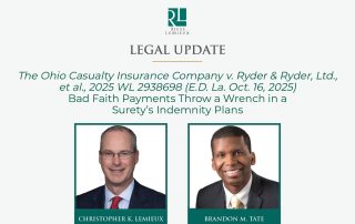 Legal Update: Bad Faith Payments Throw a Wrench in a Surety’s Indemnity Plans Authors: Christopher K. LeMieux and Brandon M. Tate The Ohio Casualty Insurance Company v. Ryder & Ryder, Ltd., et al., 2025 WL 2938698 (E.D. La. Oct. 16, 2025). In a significant decision affecting the surety and construction industry, the U.S. District Court for the Eastern District of [...]