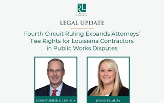 Fourth Circuit Ruling Expands Attorneys' Fee Rights for Louisiana Contractors in Public Works Disputes Authors: Christopher K. LeMieux and Jennifer Mura The Fourth Circuit’s recent decision in Couvillion Group, LLC v. Plaquemines Parish Government highlights the ability for contractors to obtain attorneys’ fees against public owners in ordinary proceedings. Previously, it was generally understood that a contractor would have to [...]