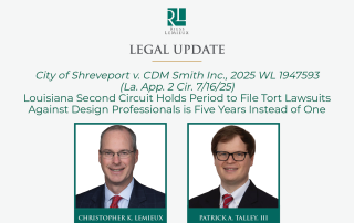 Legal Update: Louisiana Second Circuit Holds Period to File Tort lawsuits Against Design Professionals is Five Years Instead of One City of Shreveport v. CDM Smith Inc., 2025 WL 1947593 (La. App. 2 Cir. 7/16/25) Authors: Christoper K. LeMiuex and Patrick A. "Trey" Talley, III In City of Shreveport v. CDM Smith Inc., the Louisiana Second Circuit Court of Appeal [...]